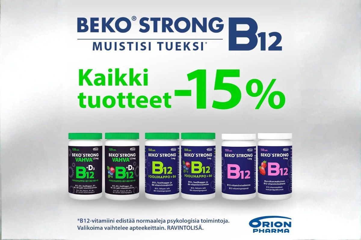 *Beko Strong B12 korostuneeseen B12-vitamiinin tarpeeseen. Sopii erityisesti esim. ikääntyneillä tai vegaaneilla. Vaihtoehtoina nieltävä tabletti tai mansikanmakuinen purutabletti.